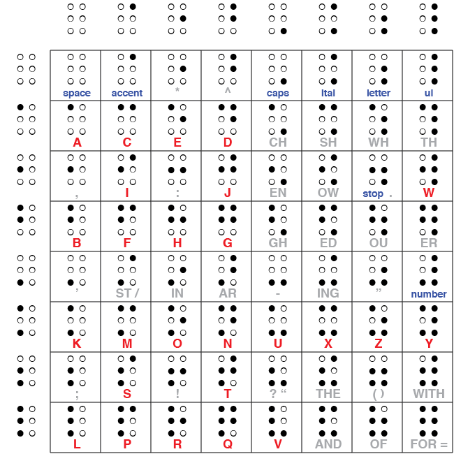 Braille can be used to depict not only the 26 letters of the alphabet but also common letter combinations, frequently seen words, and punctuation. The table below lists all of the 64 unique configurations of a 2x3 grid. To read this table, combine one of the 7 possible configurations on the far left column with one of the 7 possible configurations in the top row.