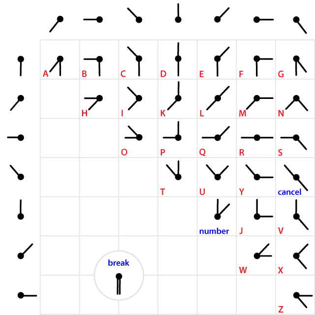 After going blind in a childhood accident, Frenchman Louis Braille developed the first version of his writing system in 1824. Braille consists of variations of a 2x3 grid of dots, where the pattern of raised and unraised bumps determines the character or letter. By feeling each character with ones finger, it is possible to read messages tactilely instead of visually. The following images show the Braille representations for each letter of the alphabet. The first ten can also signify the 10 different numerals when used in conjunction with the the Braille character for 'number' (see the table below.) For example, 'number' followed by the Braille character for A will indicate a 1.