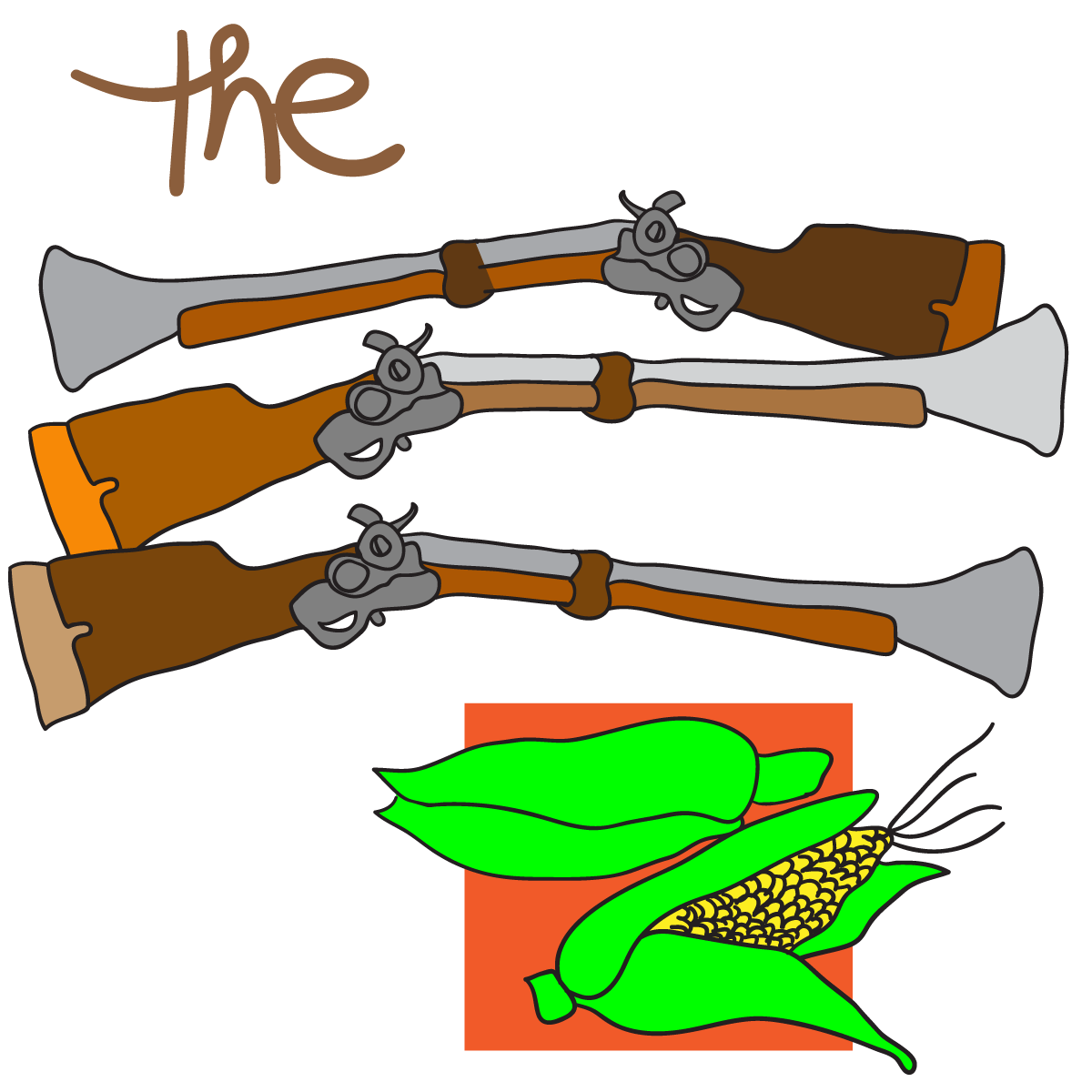 The first picture is exactly what it says: The. The next image can be interpreted in a few different ways - it is up to you to determine which interpretation is correct. Are those guns? Rifles? Muskets? Do you need to factor in the number of objects? Three guns? The final image also has several interpretations. Corn? Ears? Maize? Cobs?
